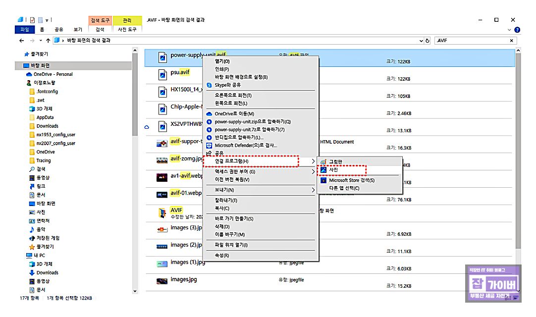'사진' 앱을 기본 이미지 뷰어로 설정한 후, AVIF 파일에 마우스 우클릭을 하고 '연결 프로그램 ▶ 사진'을 선택하거나, 파일을 더블클릭하여 바로 열 수 있습니다.