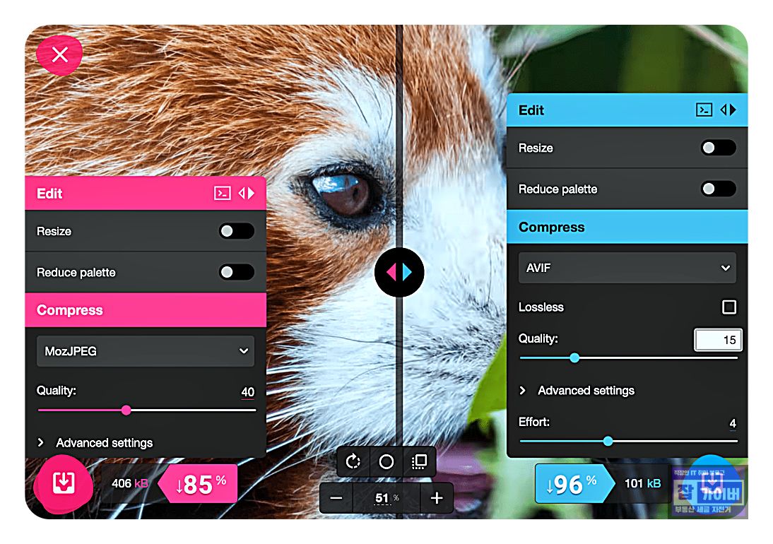 | AVIF | 최신 이미지 코덱으로, 품질 손실을 최소화한 결과물 제공 PNG에서 투명도 조절 가능, 넓은 색 영역 및 HDR 제공 애니메이션 이미지 지원 가능 |