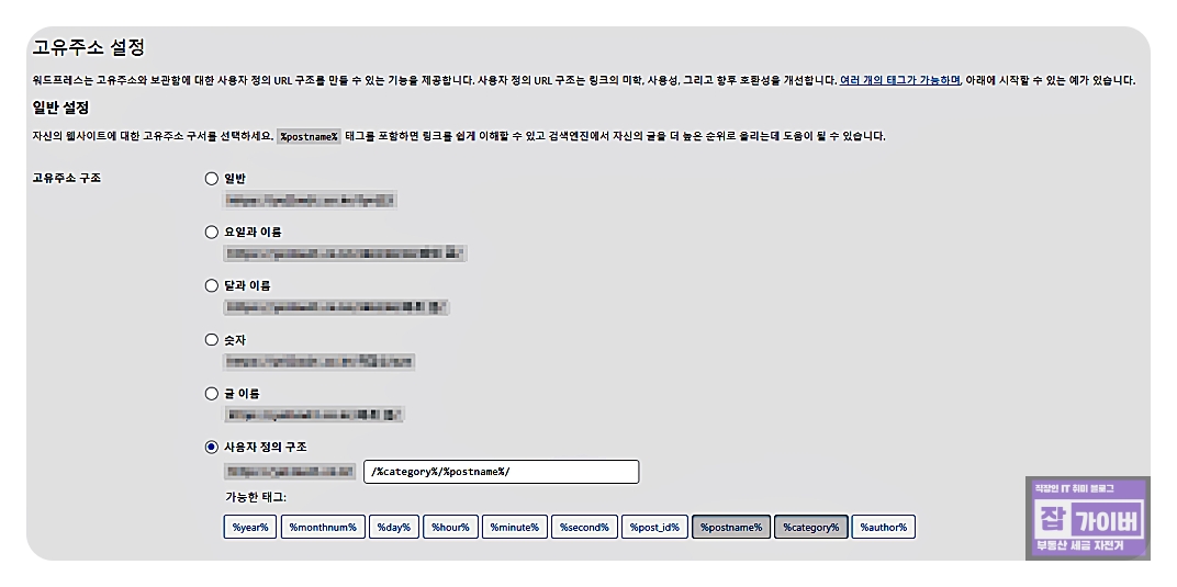 여기에서는 워드프레스의 고유주소 설정을 확인하고 저장합니다.