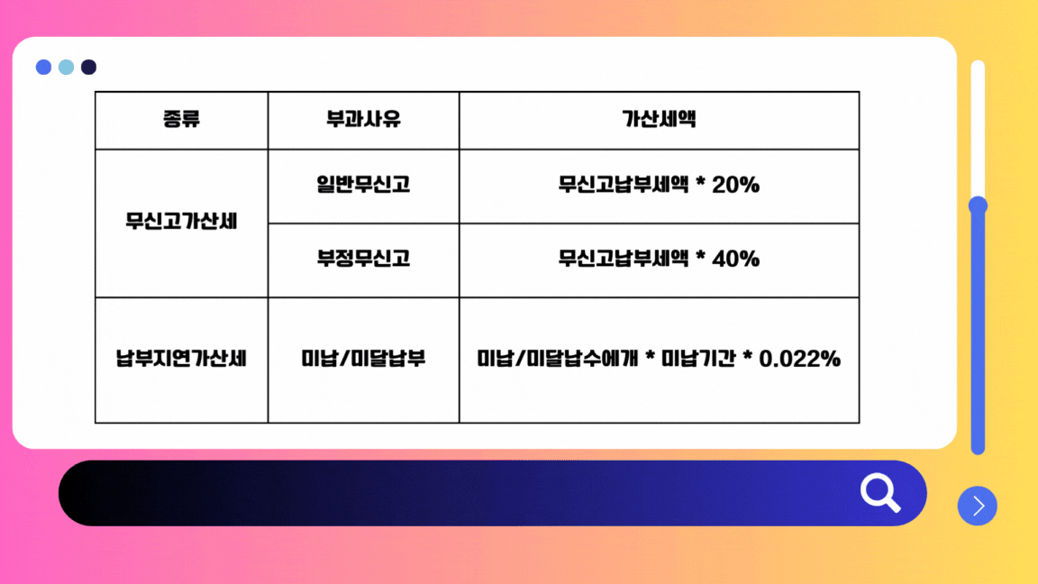 제때 종합소득세 신고하지 않거나 과소신고할 경우, 다음과 같은 종합득세 미신고 가산세가 부과됩니다