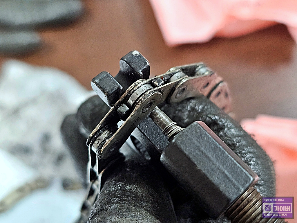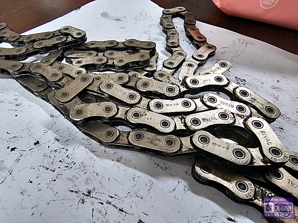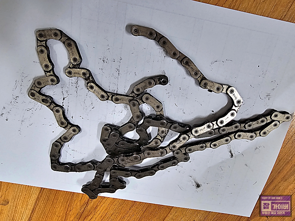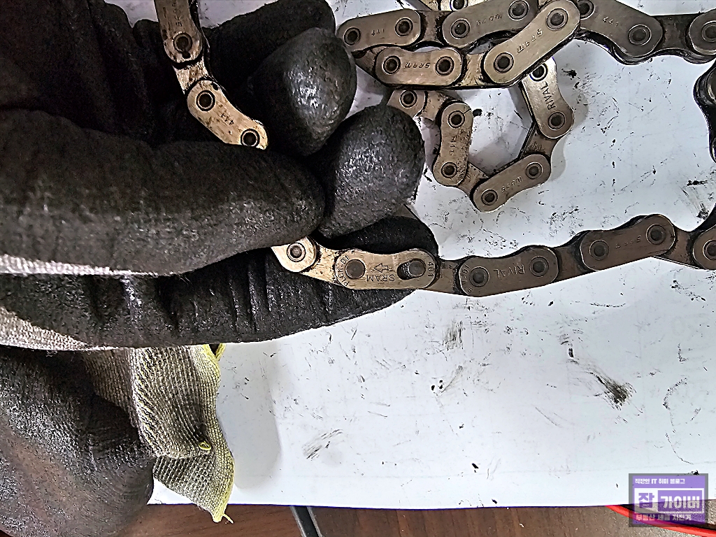 먼저 기존에 사용하던 끊어진 체인을 분리하고 상태를 확인한 후, 새로운 체인을 장착했습니다.