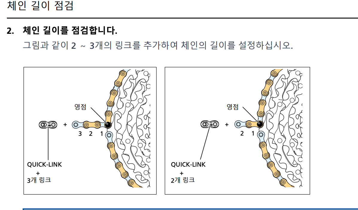 기존에 사용하던 체인 길이와 동일하게 사용하면 체인 길이를 측정할 필요 없이 편리하게 교체할 수 있습니다.