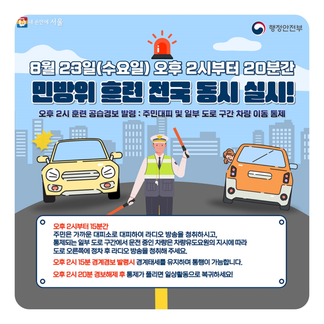 민방위 훈련은 국가적인 대피 및 비상 상황 대비를 위해 실시되는 훈련입니다. 매월 15일을 제외한 날에 오후 2시부터 약 20분 동안 전 국가적으로 시행됩니다.