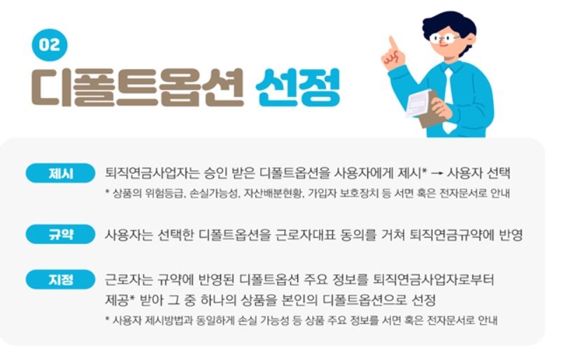 고객님께서는 근로자퇴직급여보장법 제21조의3제2항에 따라 사전지정운용방법(이하 디폴트옵션상품)을 선정하여야 합니다.