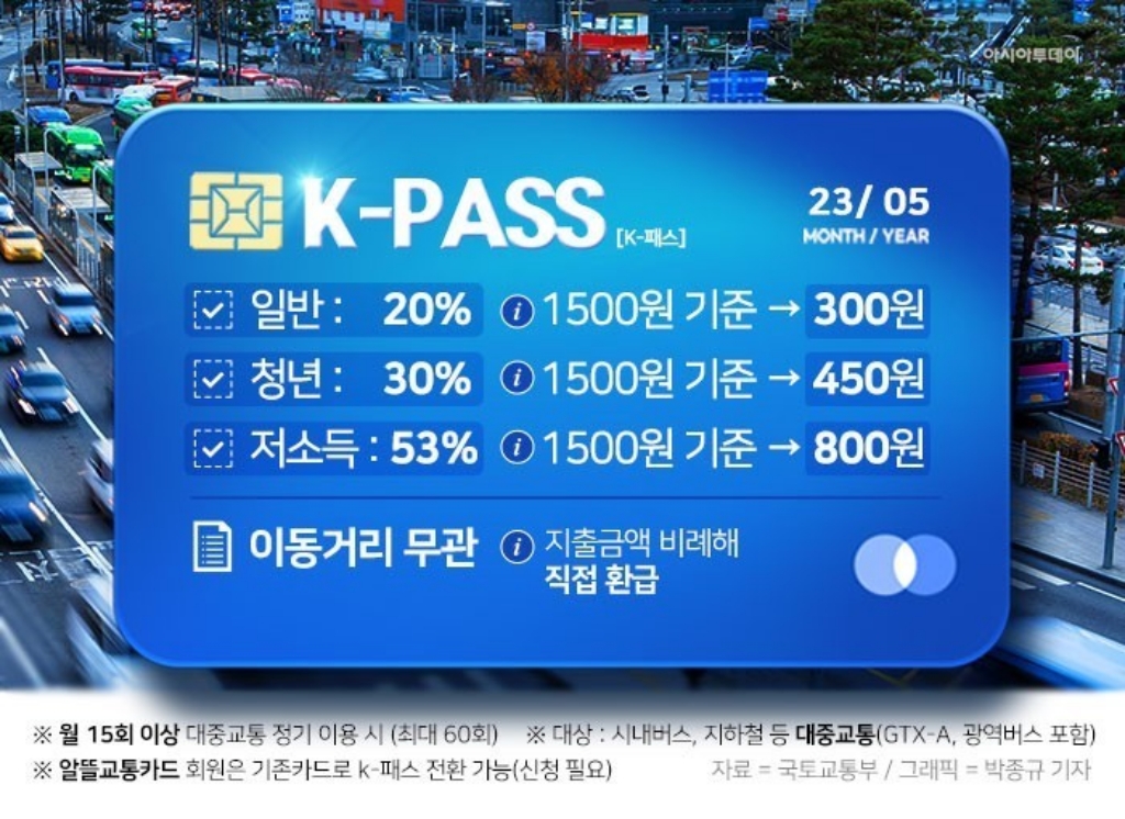 • K-패스: 대중교통 이용 요금에 따라 혜택을 제공합니다.