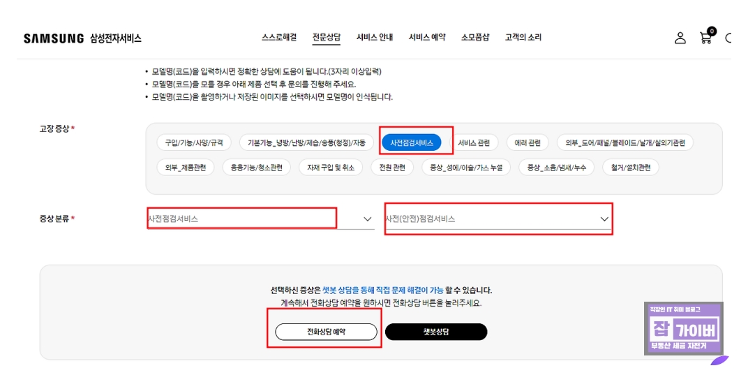 - 자가점검 후, 이상을 발견하거나 추가적인 점검이 필요한 경우 삼성전자서비스 컨택센터(1588-3366)로 전화하여 사전점검 서비스를 신청합니다.