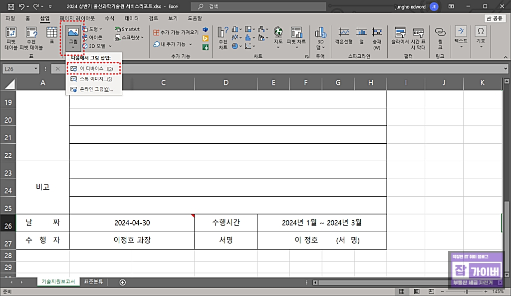 다음 엑셀에서 그림 -> 이 디바이스 선택합니다.