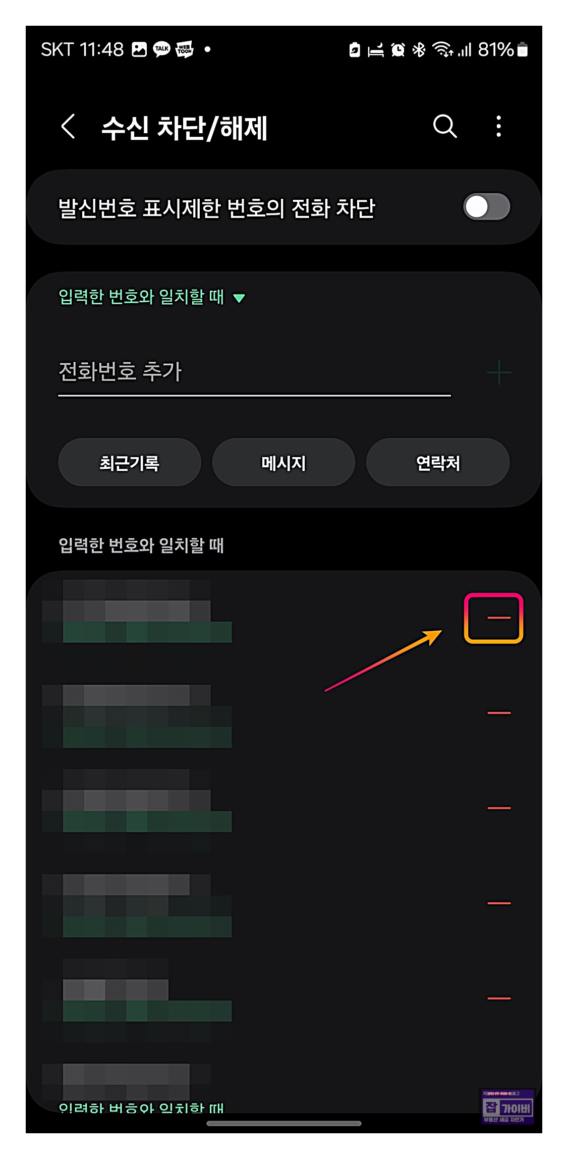 차단된 번호 옆의 "-"를 선택하여 해제하면 해당 번호의 전화와 메시지를 다시 받을 수 있습니다.