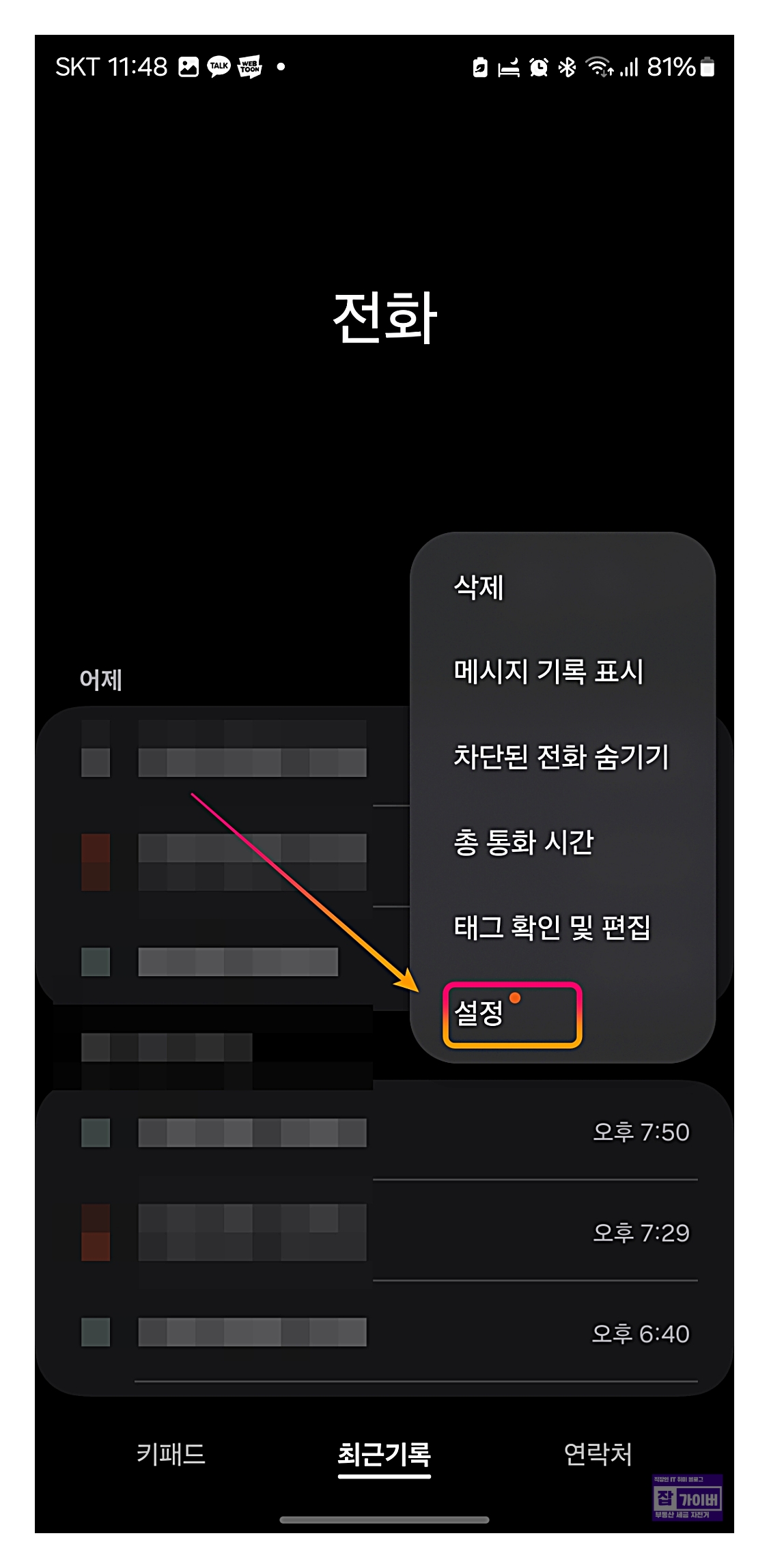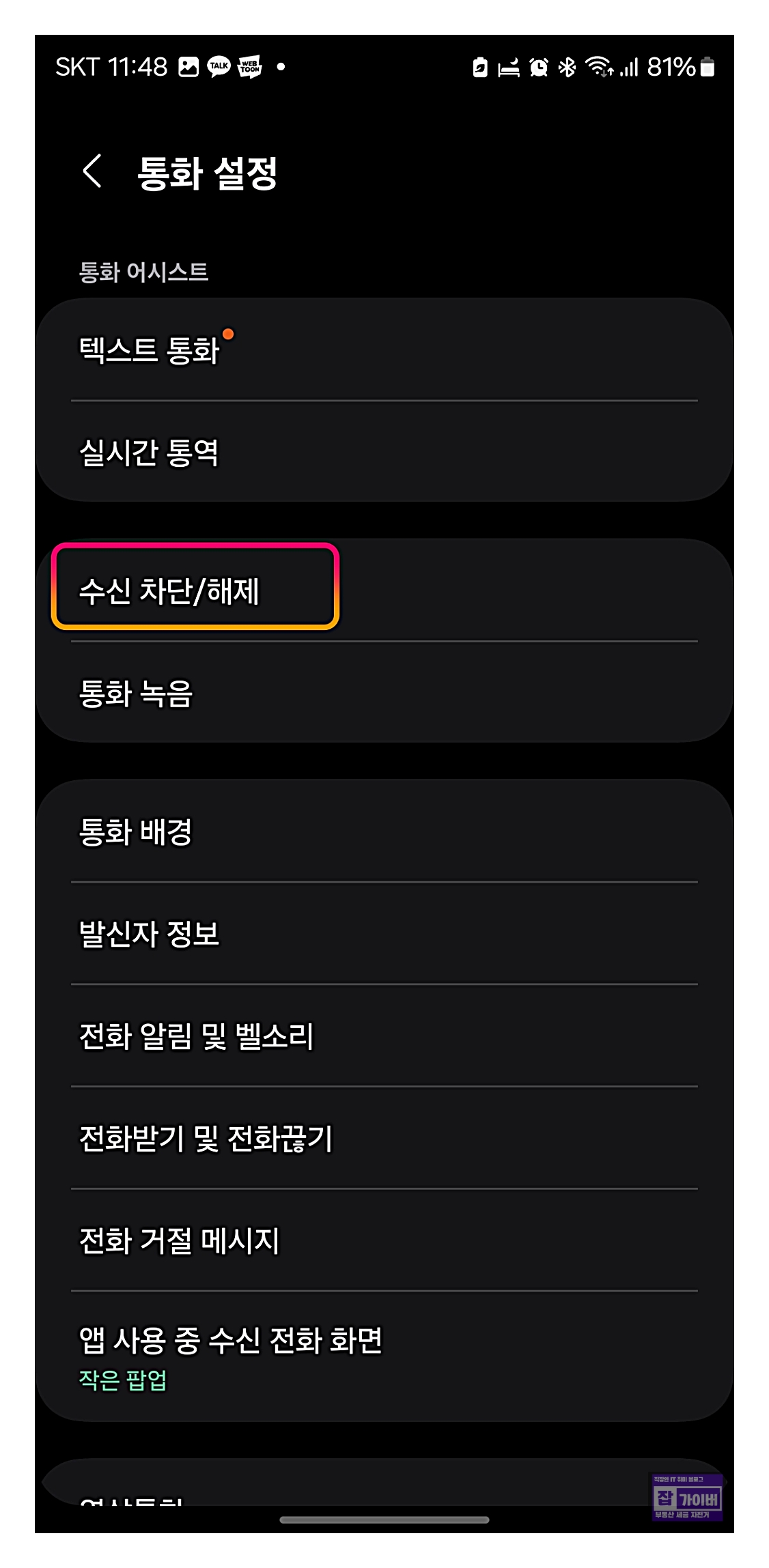 전화 앱을 실행 후 상단의 점 세 개(더보기)를 선택하여 설정으로 이동 후 수신 차단 메뉴를 선택합니다.