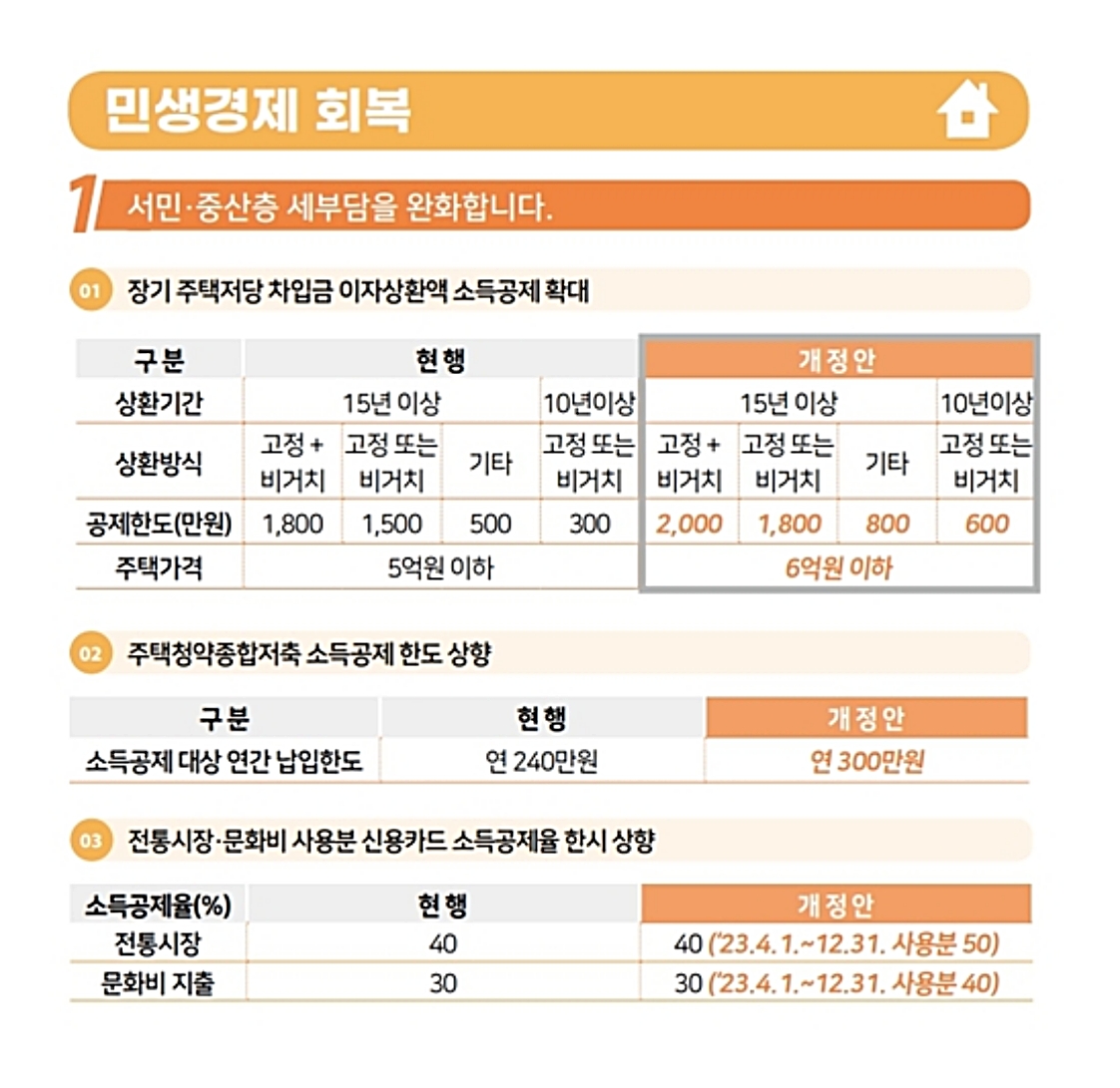 이번 주담대 개정안은 민생 경제 회복을 위해 다양한 부분에서 대책을 마련하고 있습니다. 또한, 주택청약종합저축 납입액에 대한 소득공제도 강화되며, 전통시장과 문화비 지출에 대한 신용카드 소득공제율도 상승하며 이는 내수 활성화와 소비 촉진을 위한 정책으로 이어집니다.