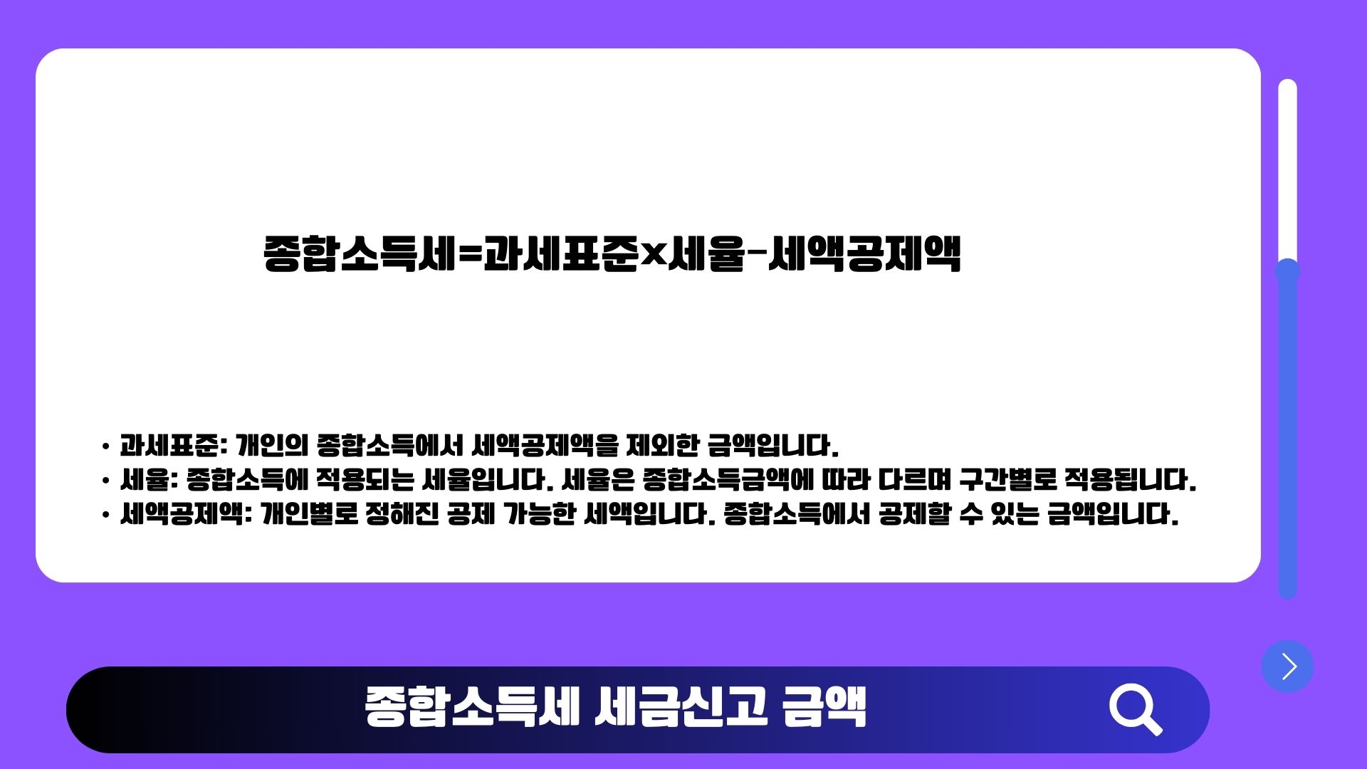 - 과세표준: 개인의 종합소득에서 세액공제액을 제외한 금액입니다.