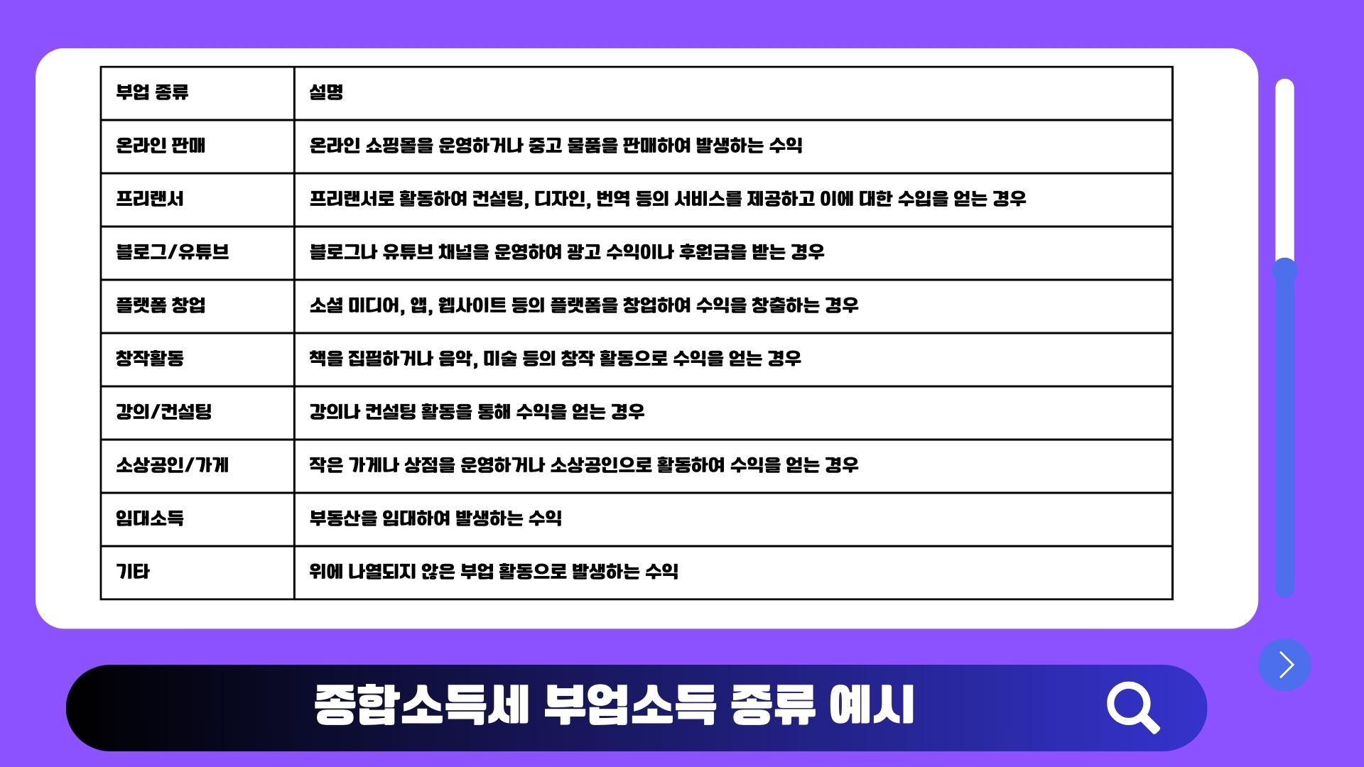 | 기타 | 위에 나열되지 않은 부업 활동으로 발생하는 수익 |