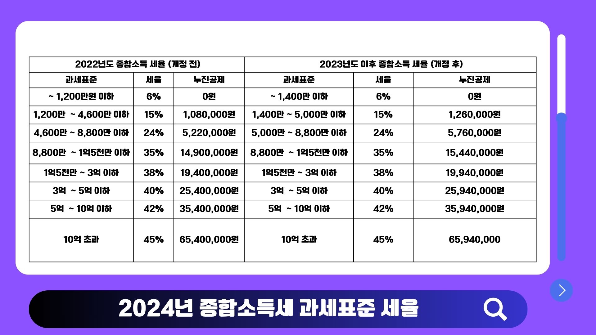 -> 즉 2024년도 5월 신고하는 종합소득세와 2024년도 2월 연말정산을 신고할 때 부터 개정된 세율 구간이 적용 됩니다.