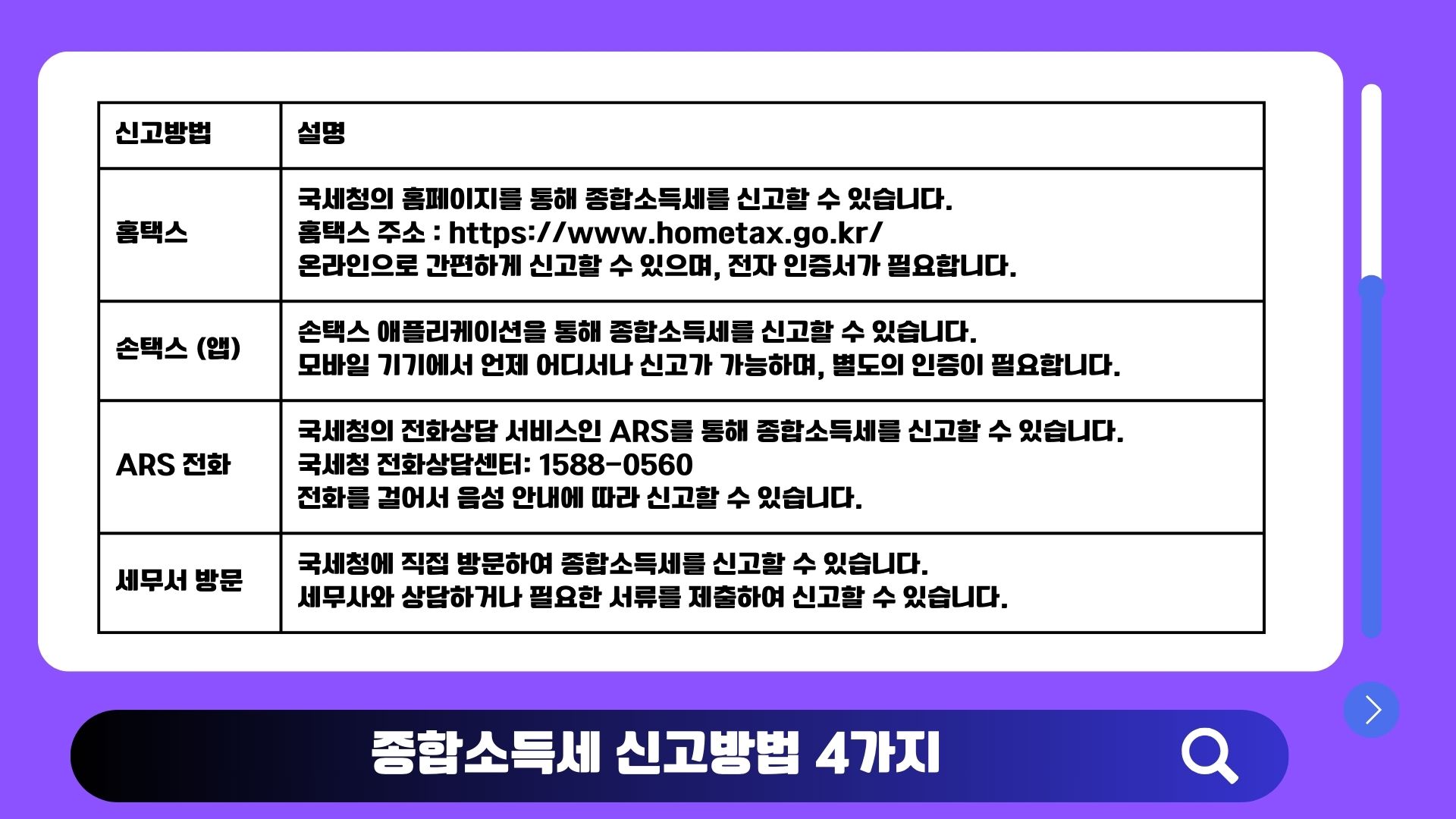 - ARS 전화 신고: 국세청 ARS 전화 서비스를 이용하여 간편하게 신고하는 방법도 있습니다.