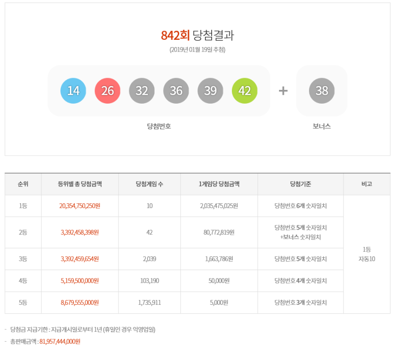 - 2등: 5개 번호 + 보너스 번호 맞히기 (약 1/1,357,510)