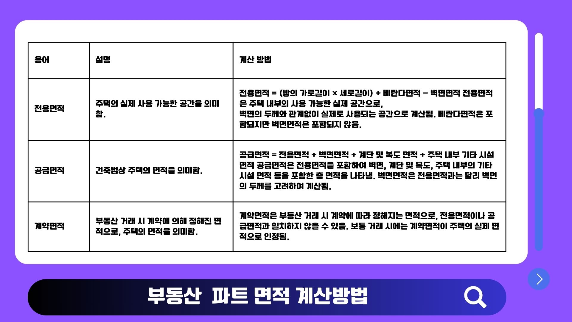 전용면적 주택의 실제 사용 가능한 공간을 의미함. 전용면적 = (방의 가로길이 × 세로길이) + 베란다면적 - 벽면면적 전용면적은 주택 내부의 사용 가능한 실제 공간으로, 벽면의 두께와 관계없이 실제로 사용되는 공간으로 계산됨. 베란다면적은 포함되지만 벽면면적은 포함되지 않음.