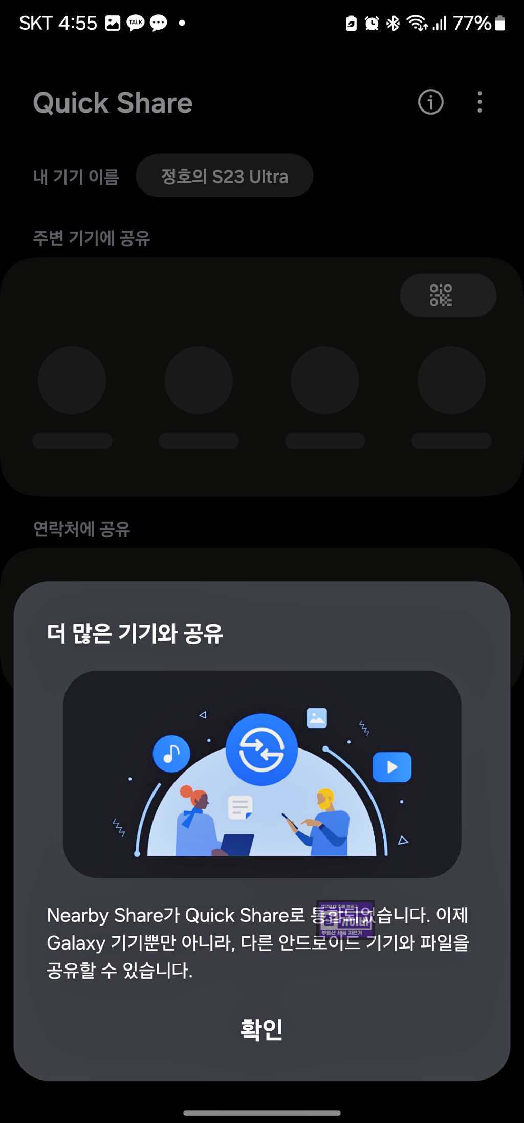 그리고 카카오톡으로 사진이나 동영상 전송 시 압축을 통해 용량을 줄여보내는게 아닌 동영상 원본자체로 보내기 위해서는 퀵쉐어링 방법을 사용하느것이 좋습니다.