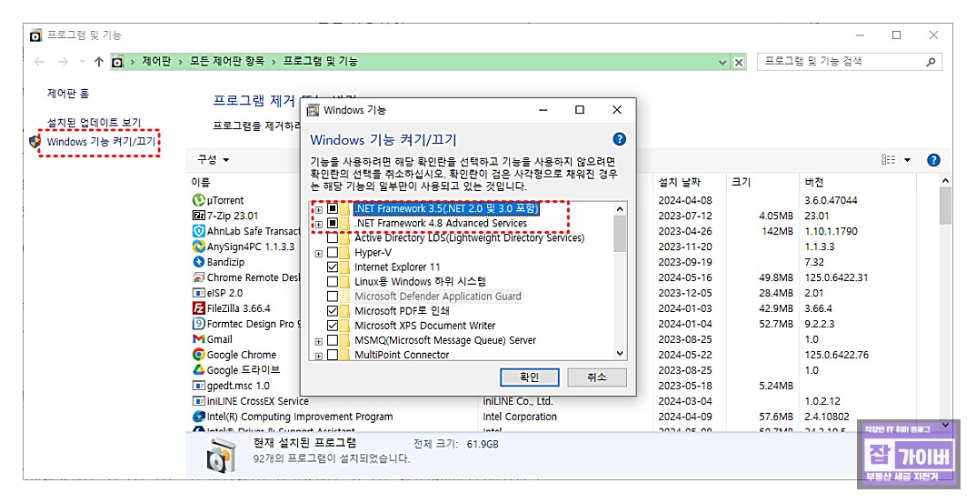 '.NET Framework 3.5(.NET 2.0 및 3.0 포함)' 항목을 체크하고 변경 사항을 저장합니다.