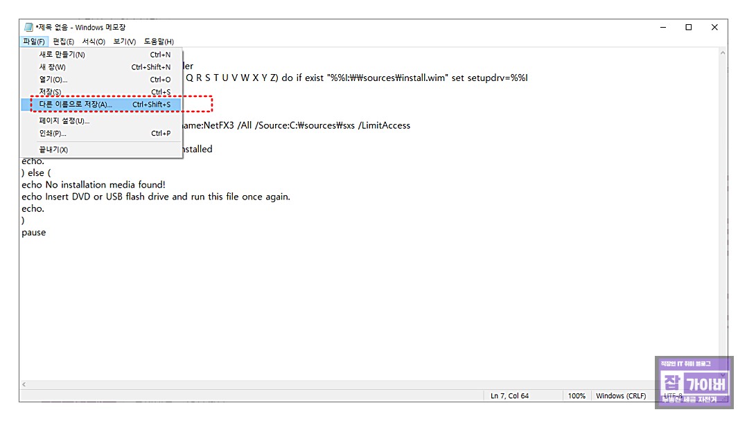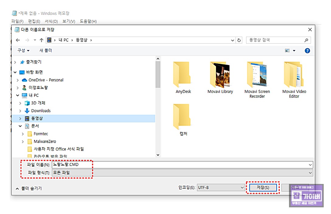 파일을 다른이름으로 저장을 선택 후 '.CMD' 확장자로 저장하고 '모든 파일' 형식으로 설정합니다.