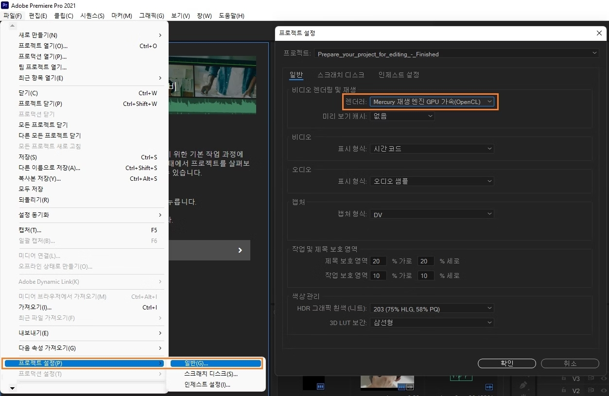 ‘편집’ 메뉴에서 ‘설정’ > '일반’으로 이동하여 'Mercury Playback Engine 소프트웨어 전용’을 선택하고 프리미어 프로를 재시작하세요.