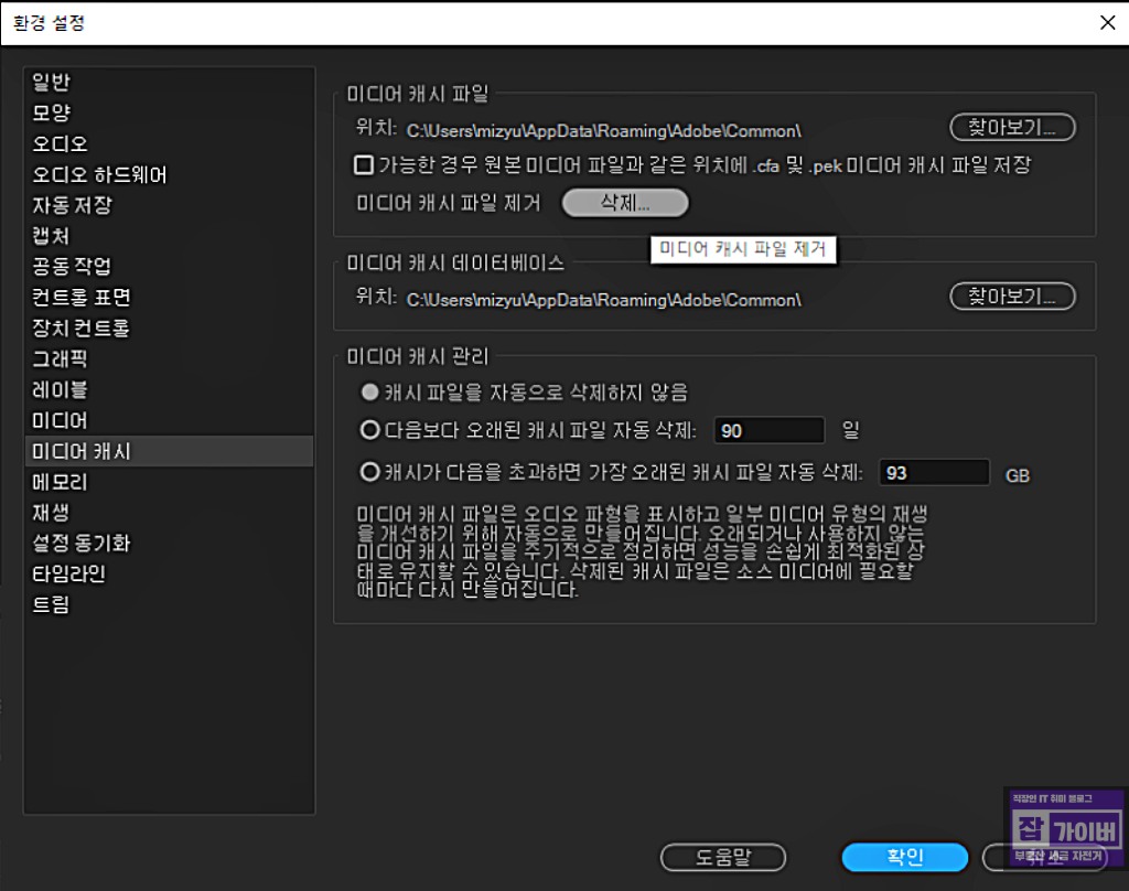 탐색기(Windows) 또는 파인더(Mac)를 열어 프리미어 프로의 캐시 폴더로 이동합니다. 해당 폴더 내의 모든 파일과 폴더를 삭제한 후 프리미어 프로를 재시작하세요.