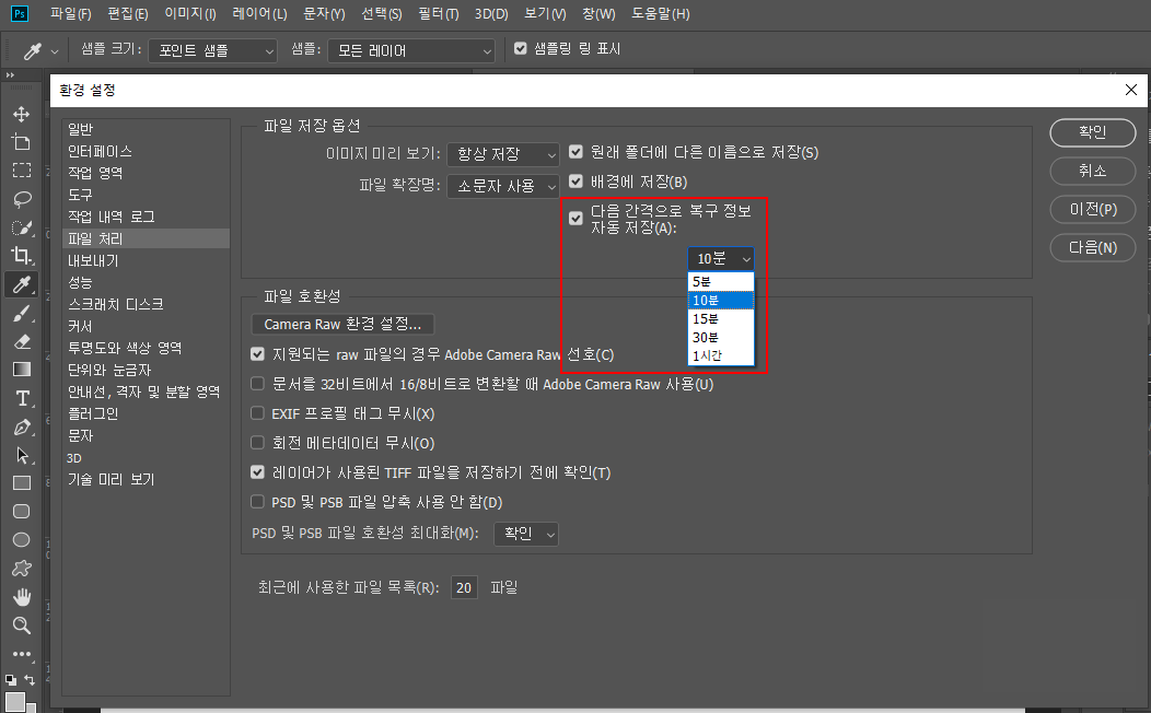 이 기능이 활성화되어 있지 않다면, '환경설정' > '파일 처리'로 이동하여 자동 복구 정보 간격 옵션을 확인하여 자동저장 기능을 활성화합니다.
