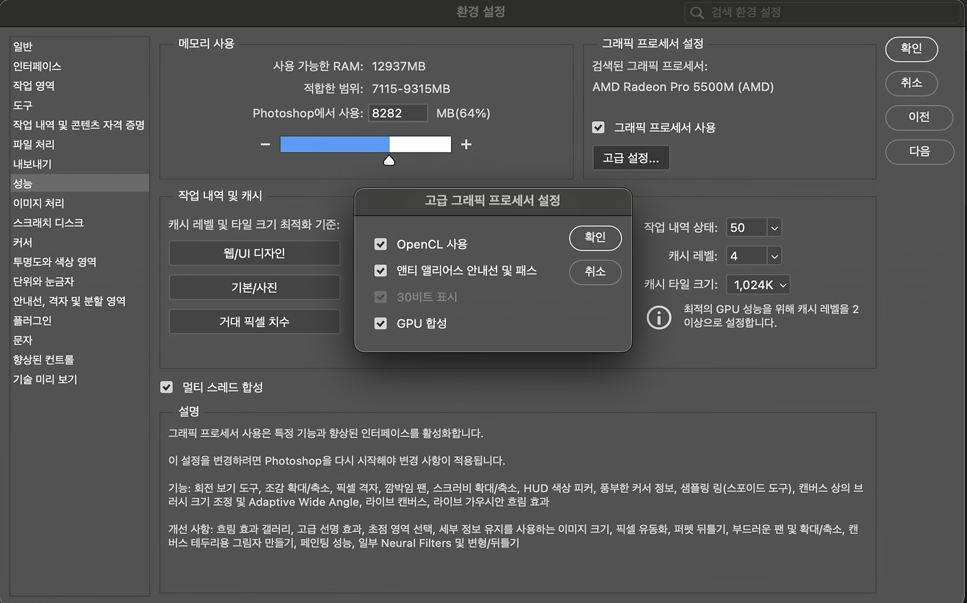 포토샵에서 작업 화면이 제대로 표시되지 않는 경우, '환경설정'에서 '성능' 설정을 확인하고, 필요에 따라 그래픽 프로세서 설정을 조정해 보세요.