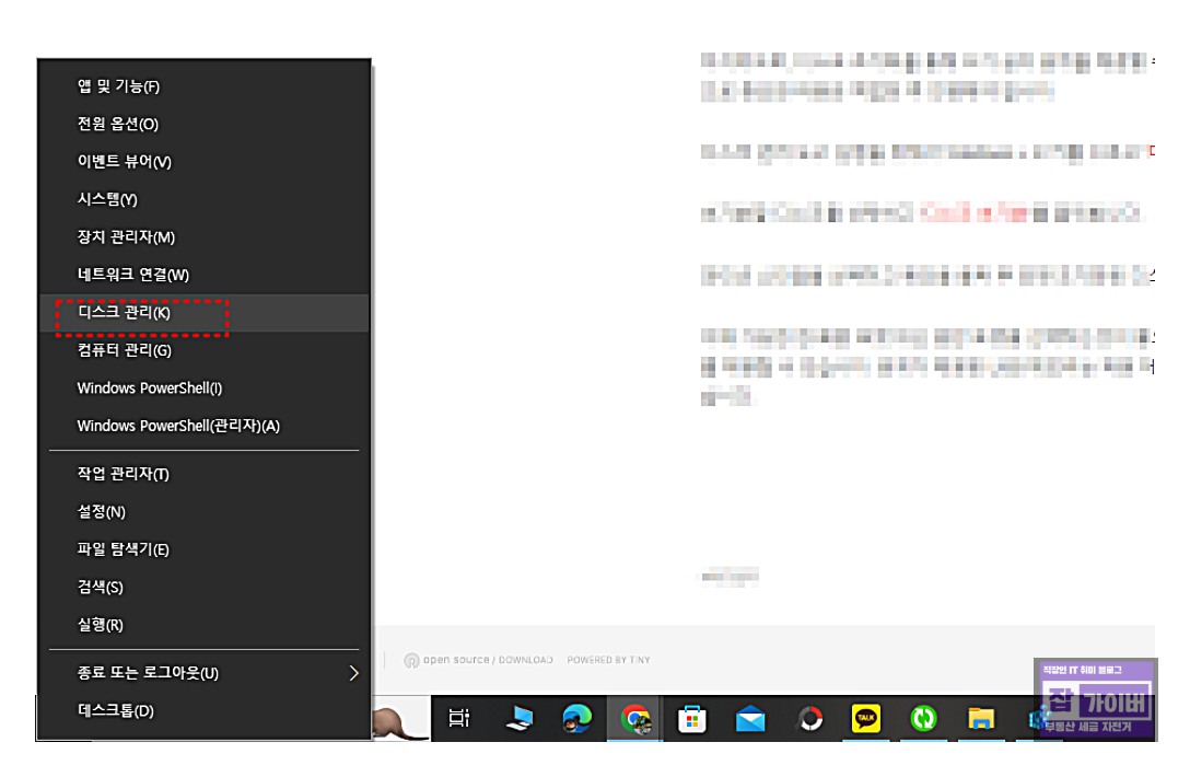 디스크 관리 도구 실행을 위해서 Windows + X 키를 누르고 '디스크 관리'를 선택합니다.