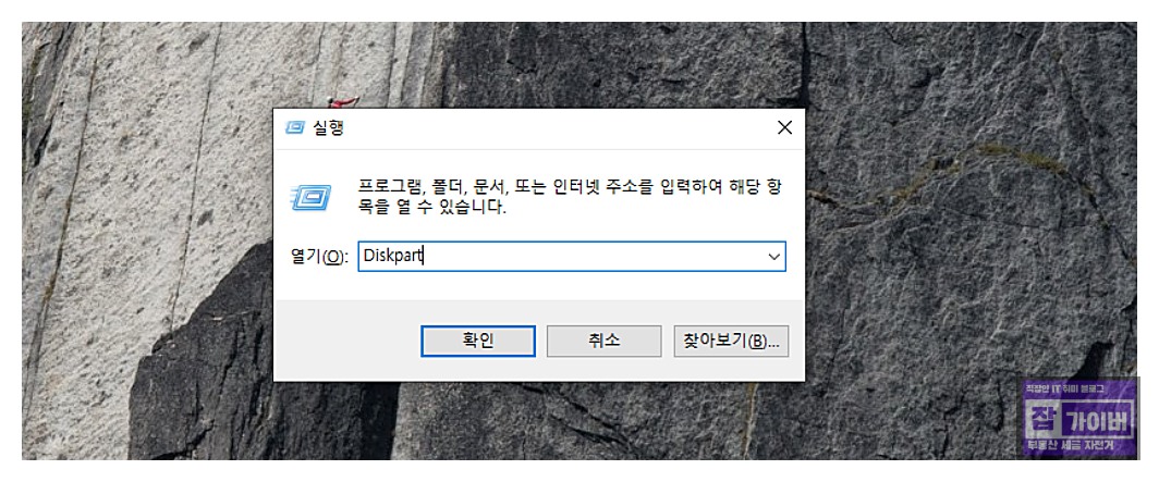 Diskpart 실행을 위해서 Windows + R 키를 눌러 실행 창을 엽니다.