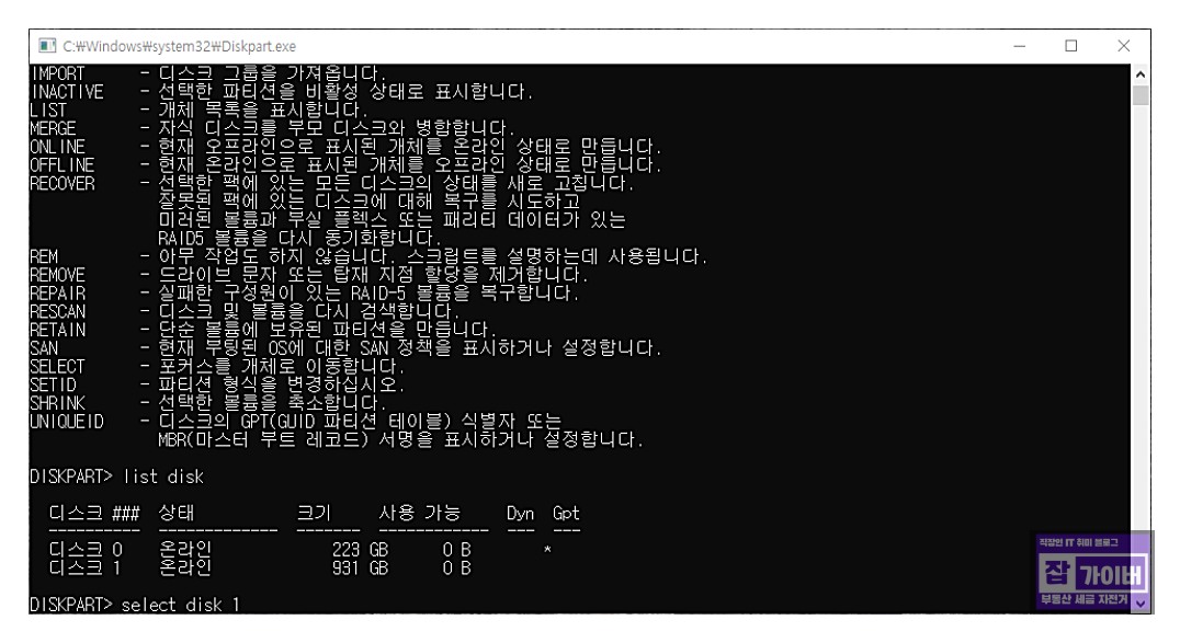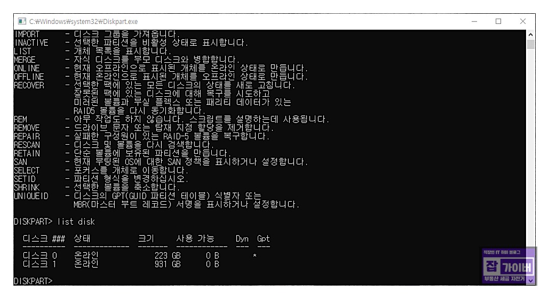 디스크 선택 및 쓰기 금지 해제를 위해 `list disk` 명령을 입력하여 연결된 디스크 리스트를 확인합니다.