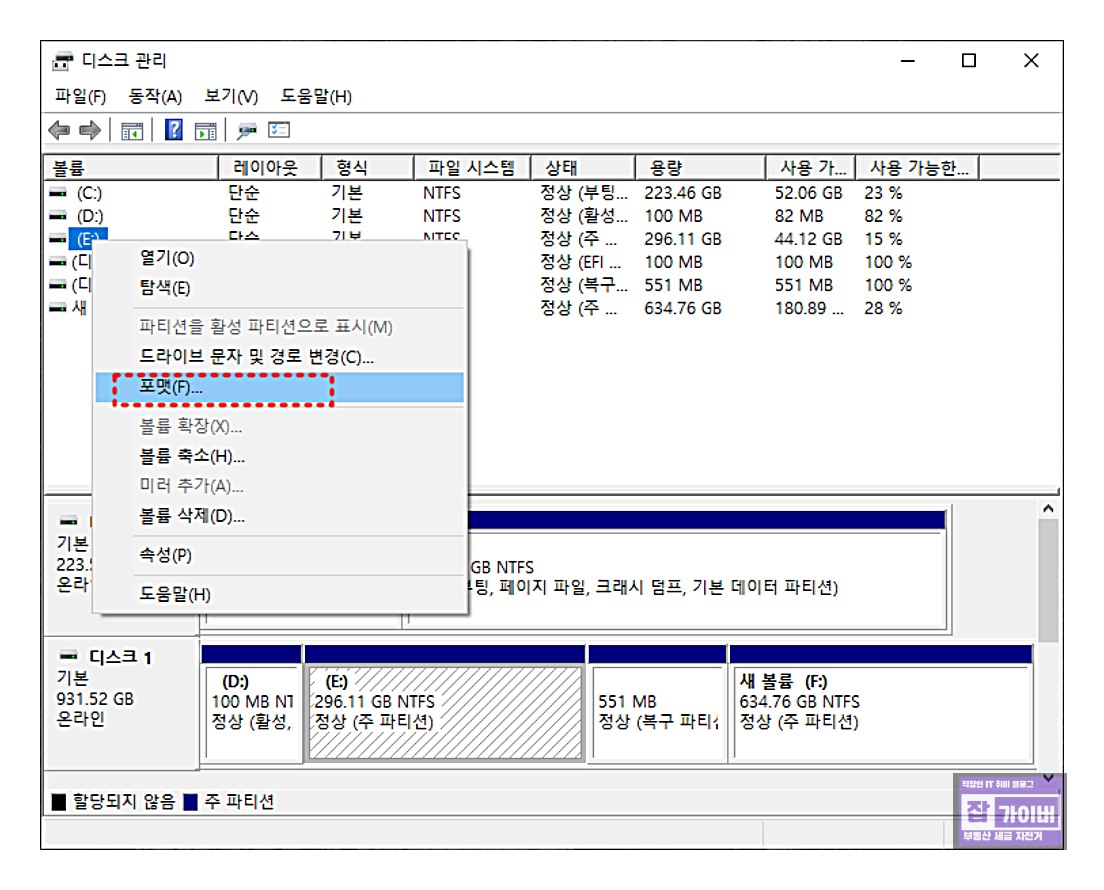 파티션 스타일을 선택하고 확인을 클릭 후 포맷 초기화된 디스크를 마우스 오른쪽 버튼으로 클릭하고 '포맷'을 선택합니다.