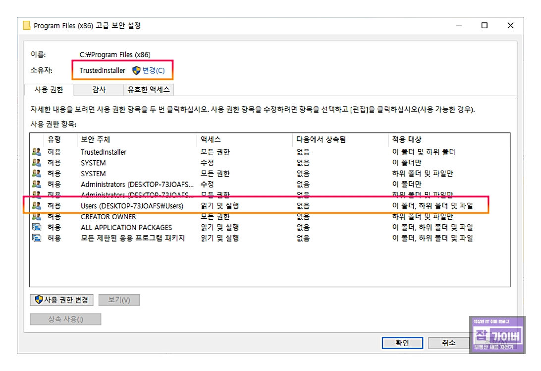 고급 보안 설정 창에서 상단에 표시된 소유자를 현재 사용자로 변경을 위해 변경 버튼을 클릭하고, 사용자 또는 그룹 선택 창에서 현재 윈도우에 로그인한 사용자를 선택합니다.