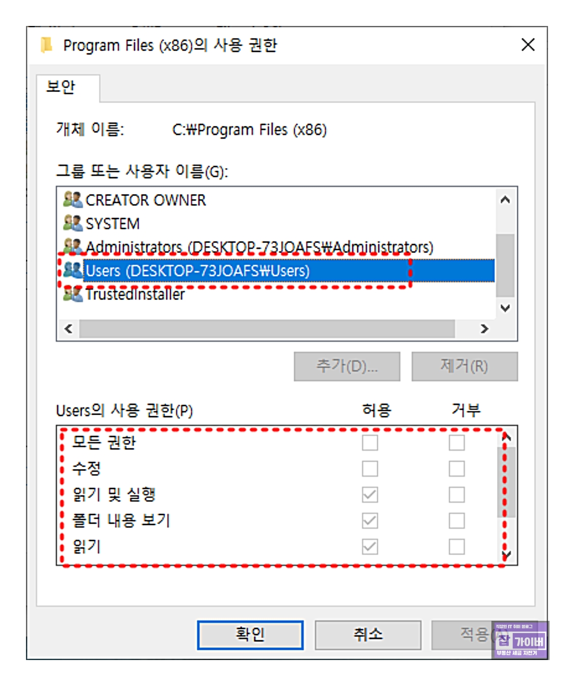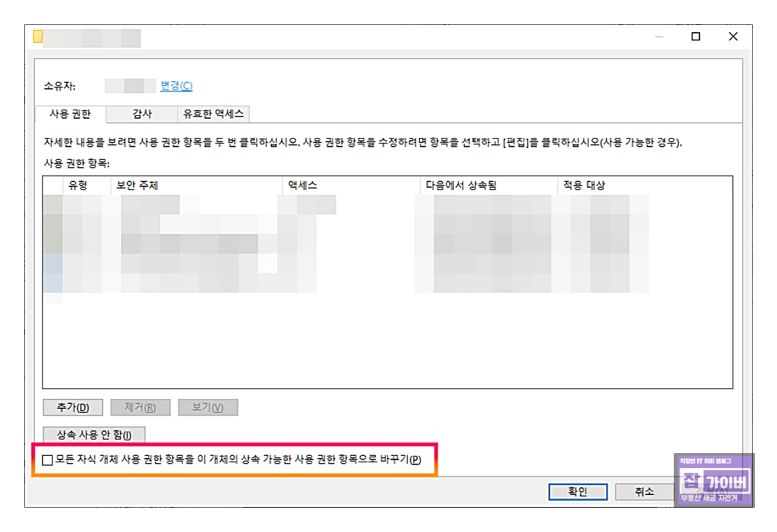 모든 권한을 부여하고, "모든 자식 개체 사용 권한 항목을 이 개체의 상속 가능한 사용 권한 항목으로 바꾸기" 옵션을 체크합니다.