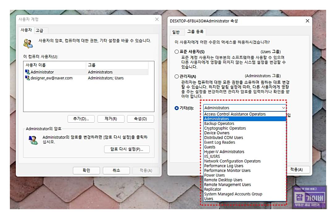 | Administrator | 모든 권한을 가진 기본 관리자 계정. 시스템 설정 변경, 프로그램 설치/제거, 사용자 관리 등 모든 작업 가능. |