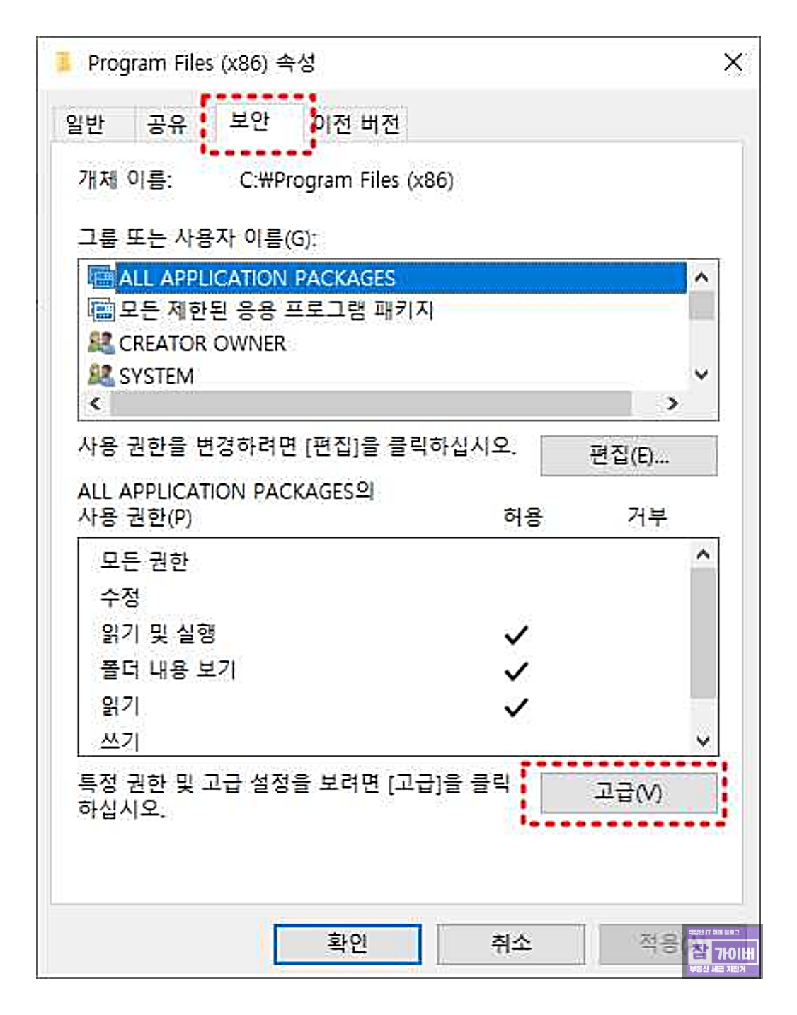속성 창에서 보안 탭을 선택한 후 고급 버튼을 클릭합니다.