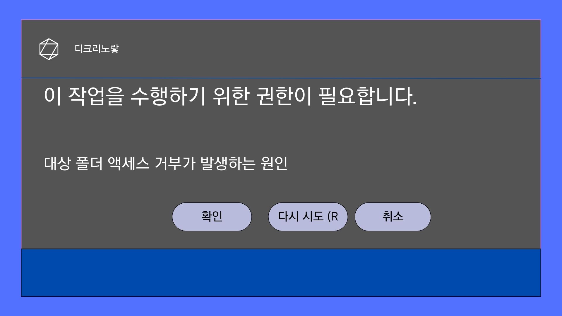 윈도우10과 윈도우11에서는 보안을 강화하기 위해 특정 권한이 없는 사용자가 폴더에 접근하거나 파일을 조작하려 할 때 "이 작업을 수행하기 위한 권한이 필요합니다"라는 오류 메시지를 표시합니다.