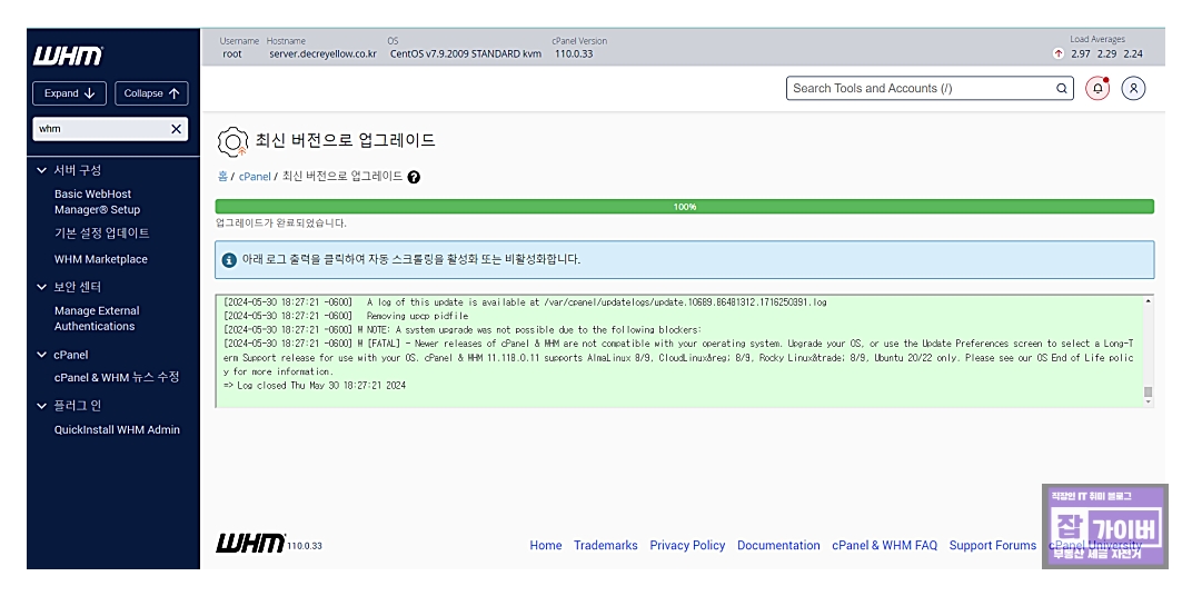 근대 문제는 씨패널 업데이트 후 나오는 cPanel & WHM 버전 110은 CentOS 7을 지원하는 마지막 버전입니다.