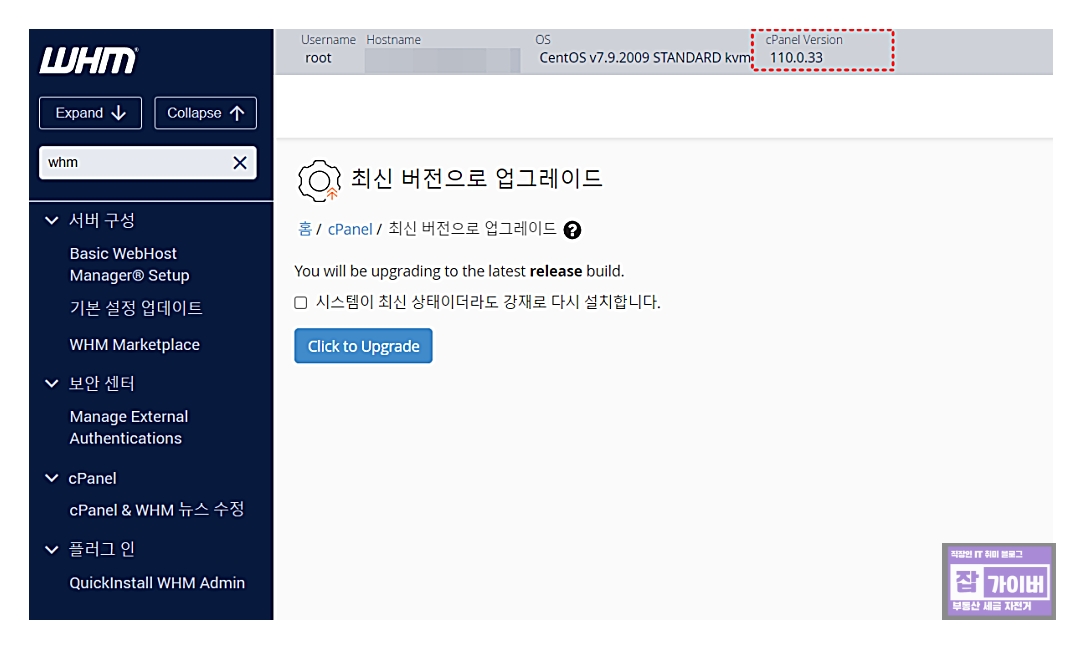 우선 WHM & C-Panel 잘 사용하진 않지만 불안하기 때문에 업데이트를 하기 위해 whm 로그인합니다.