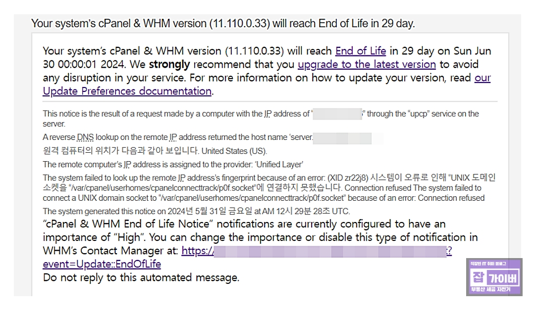 “cPanel & WHM End of Life Notice” notifications are currently configured to have an importance of “High”. You can change the importance or disable this type of notification in WHM’s Contact Manager at: https://server.xxx.co.kr:2087/scripts2/editcontact?event=Update::EndOfLife