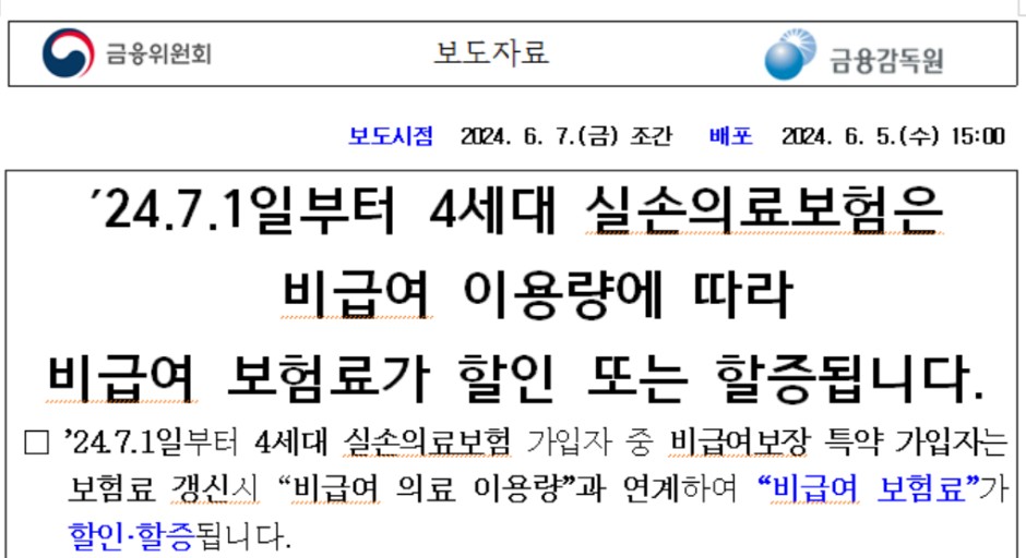 2024년 7월 실손보험료 비급여 할증 4세대 1년간 보험금 미수령 시 할인