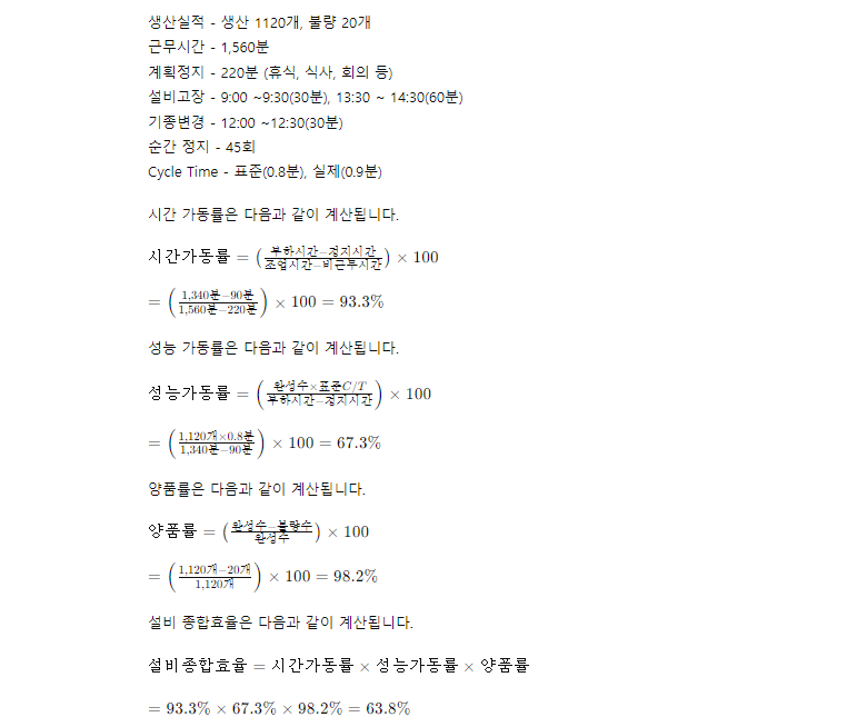 위의 데이터를 기반으로 시간 가동율, 성능 가동율 및 양품률을 계산하여 설비 가동율을 산출합니다.