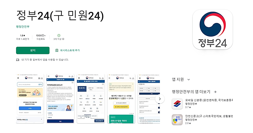 먼저, 구글 플레이스토어나 앱스토어에서 정부24 앱을 다운로드하고 설치해주세요.