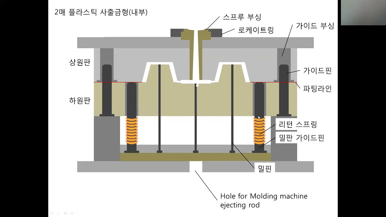 | 이젝터 핀 (Ejector Pin) | 성형된 제품을 금형에서 밀어내기 위해 사용되는 핀입니다. 제품이 금형에 붙어있는 것을 방지하고, 성형품을 쉽게 제거할 수 있게 합니다. |