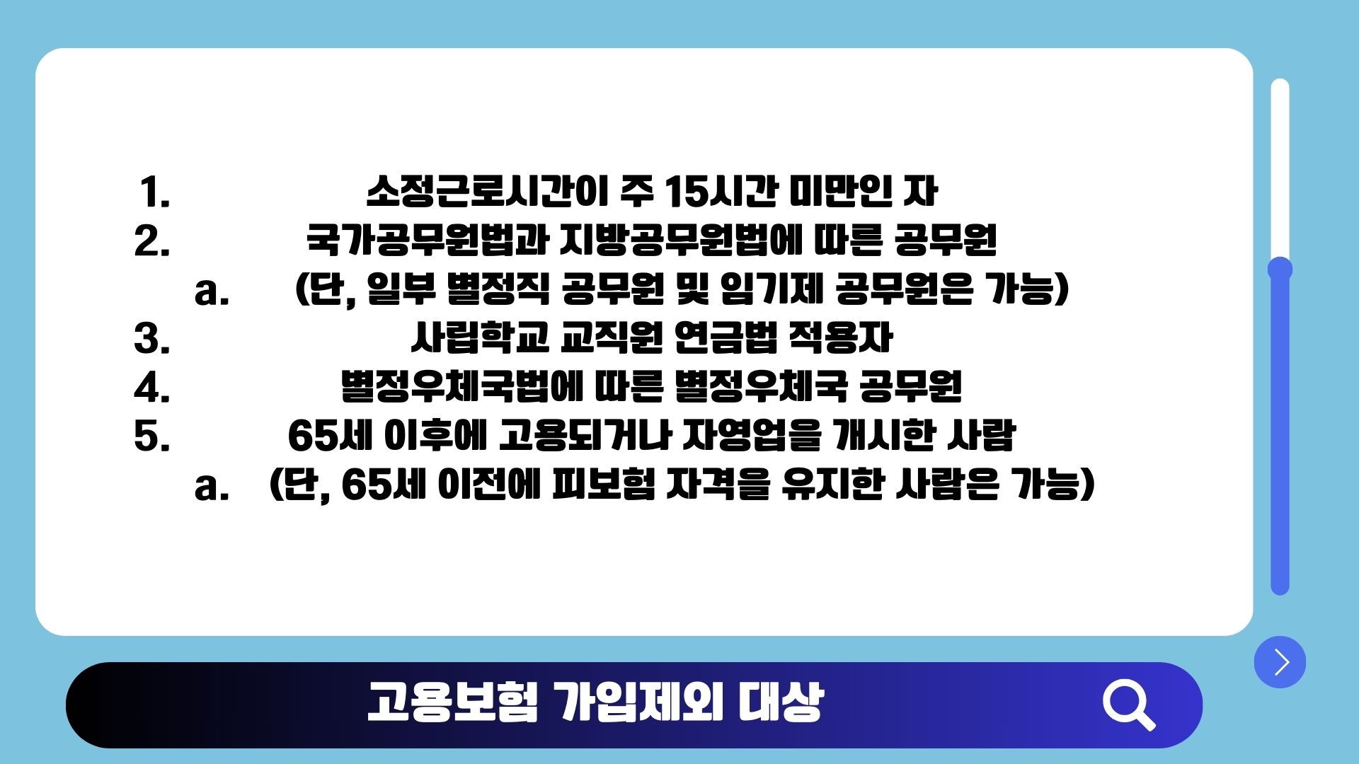 - 65세 이후에 고용되거나 자영업을 개시한 사람 (단, 65세 이전에 피보험 자격을 유지한 사람은 가능)