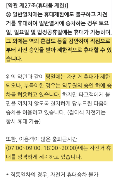 평일 지하철 자전거 휴대 규정