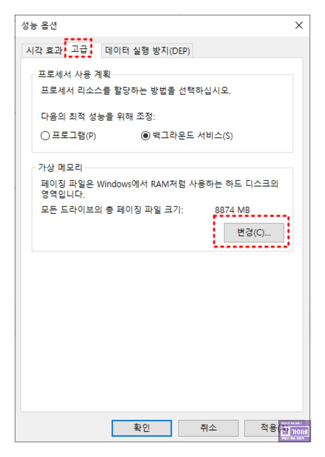 성능 옵션 창에서 [고급] 탭의 [변경]을 클릭합니다.