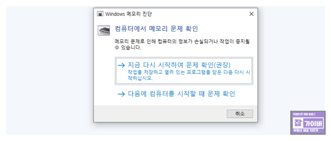 메모리 진단 창에서 [지금 다시 시작하여 문제 확인]을 클릭하여 진단을 시작합니다.