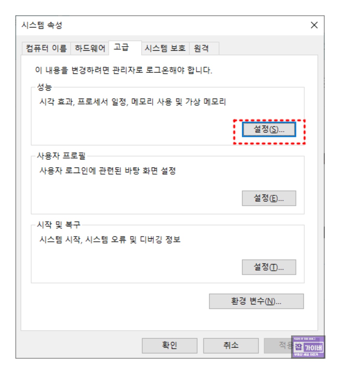 시스템 속성 창에서 [고급] 탭의 [성능] 섹션에서 [설정]을 클릭합니다.