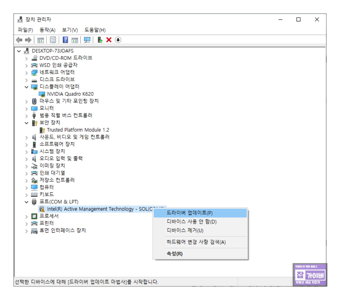 노란색 느낌표가 있는 장치를 찾아 우클릭하여 [드라이버 소프트웨어 업데이트]를 클릭합니다.