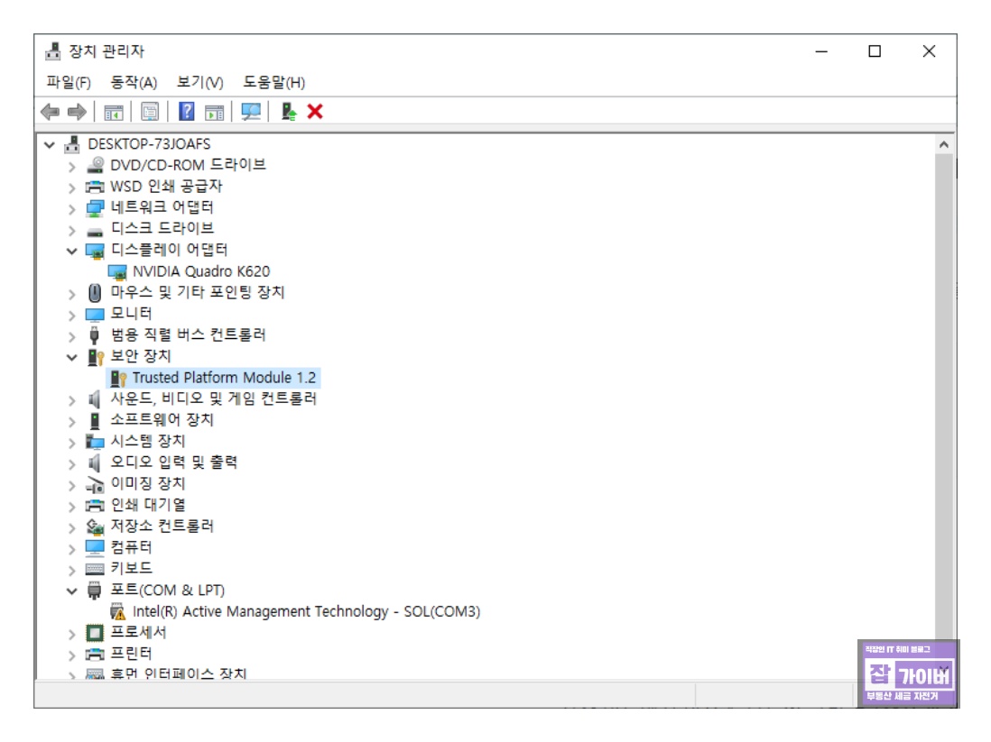 시작 버튼에서 마우스 오른쪽 클릭 후 [장치 관리자]를 선택합니다.